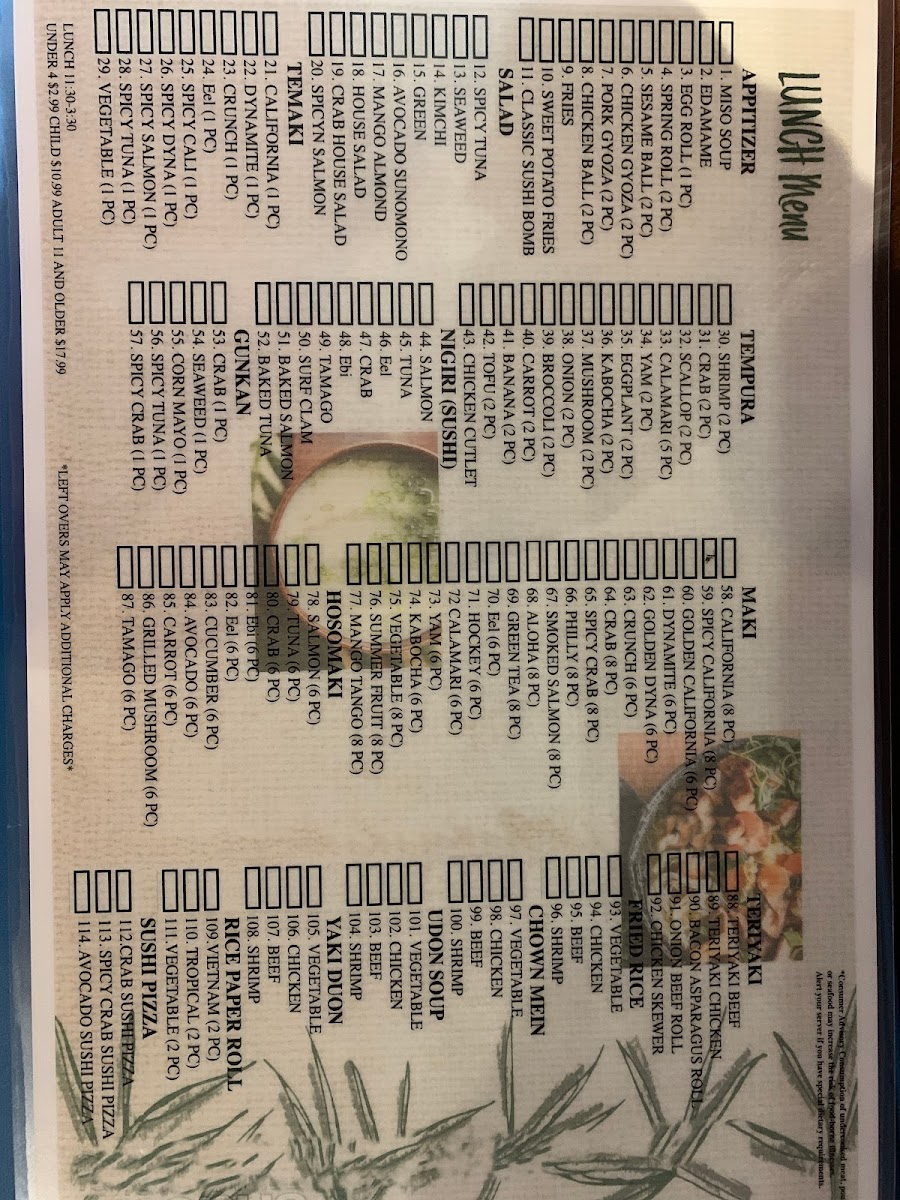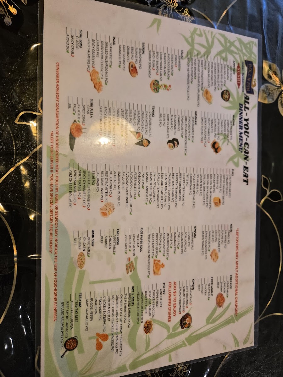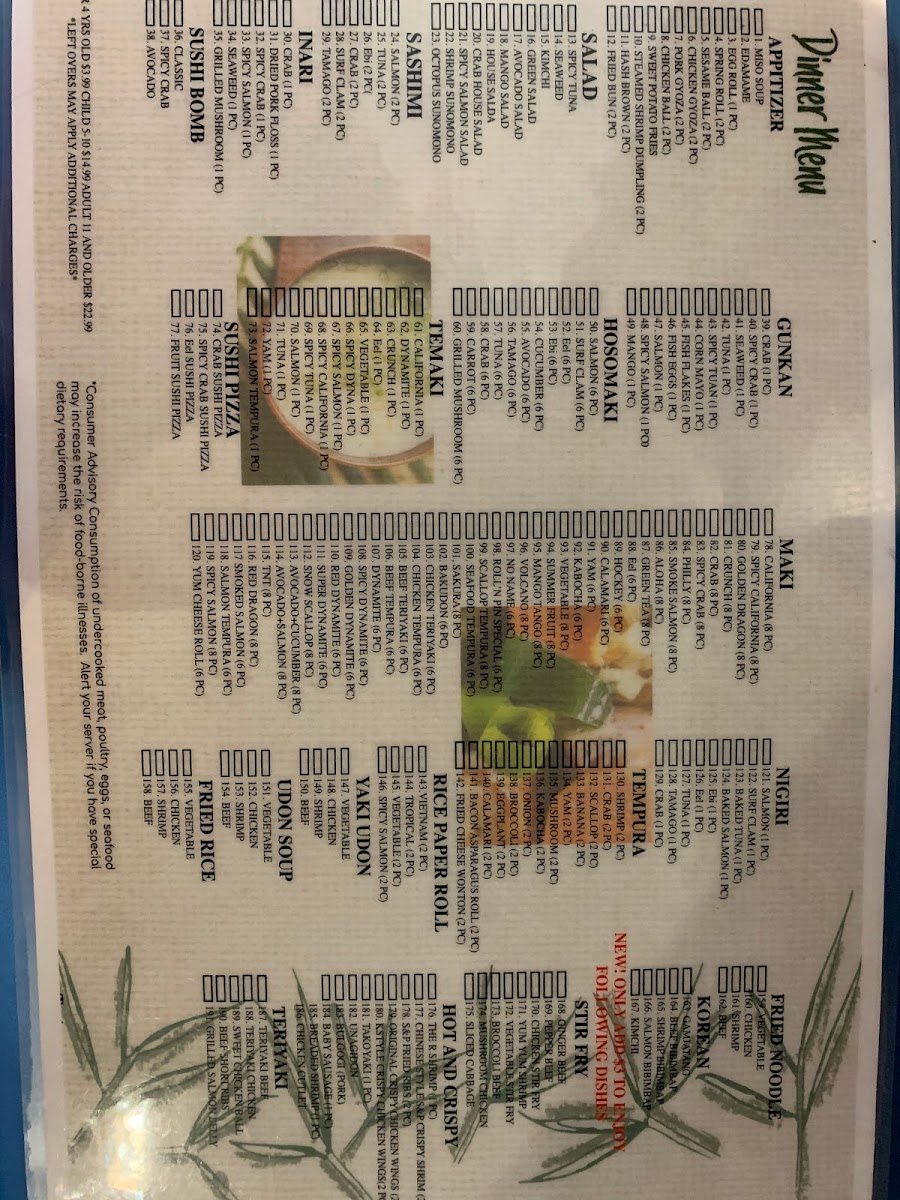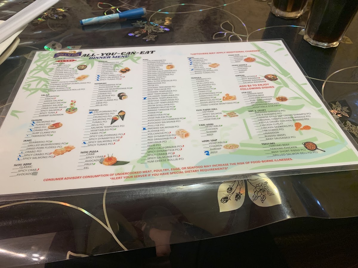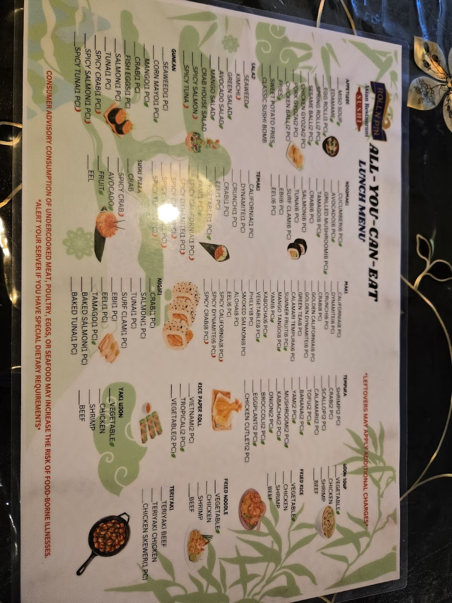 The menu also shines in its selection of sashimi, including Salmon Sashimi (7 Pieces) and Octopus Sashimi (7 Pieces), as well as nigiri choices such as Baked Tuna Nigiri (2 Pieces) and Salmon Nigiri (2 Pieces). Creative options like Eel Sushi Pizza, Fruit Pizza, and Crab Sushi Bomb add a playful twist, while the Hot and Crispy section, featuring Chinese Style S&P Shrimp (7 Pieces) and Crispy Chicken Wings (7 Pieces), provides satisfying finger foods. The Tempura and Rice Paper Roll offerings, including Crab Tempura (6 Pieces) and Vietnam Rice Paper Roll (2 Pieces), round out the menu with light, flavorful bites. Complementing these dishes are refreshing beverages like Pure Leaf Mango Herbal Tea 547 Ml and Diet Pepsi, making it easy to find something for every taste. Overall, Roll’n Pin’s menu balances variety, creativity, and familiar favorites, making it a go-to destination for both casual diners and sushi enthusiasts alike.